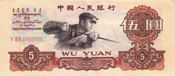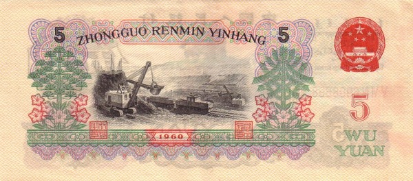 The reverse of the note features an industrial scene showing workers operating large-scale machinery within a factory setting. This imagery reflects the political and economic priorities of the era, highlighting industrialisation, collective labour and national self-reliance. The denomination “Five Jiao / Five Yuan” is prominently displayed alongside detailed ornamental borders.