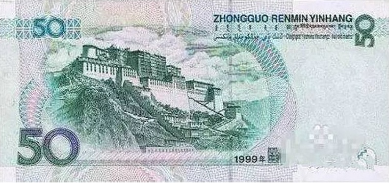 The reverse of the 50 Yuan banknote features an illustration of the Potala Palace in Lhasa, Tibet. This iconic architectural landmark symbolises China’s cultural heritage and historical unity. The scene is rendered with fine-line engraving and layered background patterns, adding aesthetic value and enhancing security.