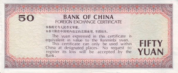 The reverse is printed primarily in English and clearly identifies the note as a “Bank of China Foreign Exchange Certificate.” It states that the yuan expressed is equivalent in value to Renminbi yuan, while explaining that the certificate may only be used within China at designated places. The reverse design incorporates fine guilloché patterns, ornate borders, and the denomination “Fifty Yuan” displayed clearly for international users.