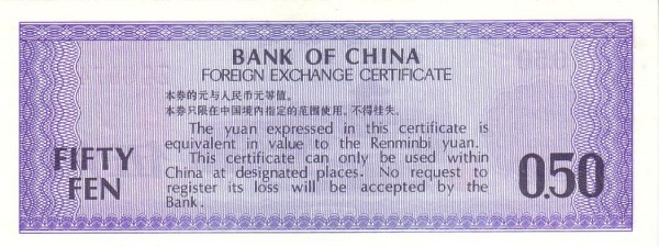 The reverse is printed primarily in English and clearly identifies the note as a “Bank of China Foreign Exchange Certificate”. It explains that the yuan expressed in the certificate is equivalent in value to the Renminbi yuan, while stating that the certificate may only be used within China at designated places. The denomination “Fifty Fen” and “0.50” are prominently displayed, surrounded by ornate borders that mirror the formal, institutional style of the era.