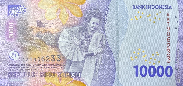 The reverse of the note depicts a traditional Indonesian cultural dance scene, showing a female dancer holding a fan, dressed in detailed ceremonial costume. The dancer is set against a softly coloured landscape with layered textures, botanical motifs, and stylised natural forms. The denomination “10000” is repeated clearly on the right-hand side, alongside serial numbering and tactile features for accessibility. The composition balances cultural storytelling with modern security printing, making the reverse visually distinctive and instantly recognisable.