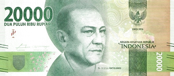 On the front of the banknote, the dominant feature is the engraved portrait of Dr. G.S.S.J. Ratulangi, a prominent Indonesian national hero and statesman. The portrait is rendered in fine line intaglio-style engraving, set against layered guilloché patterns and micro-geometric backgrounds. To the right appears the Garuda Pancasila national emblem, while the denomination “20000” is printed in bold numerals at the corners. Security elements visible in the image include colour-shifting inks, a vertical security strip, and tactile elements designed to aid recognition.