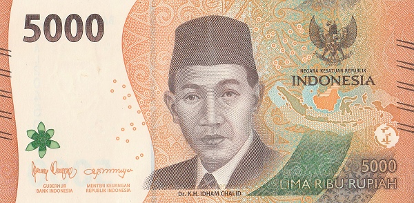 On the front of the banknote, the dominant feature is a finely engraved portrait of Dr. K.H. Idham Chalid, a prominent Indonesian national figure, shown wearing traditional formal attire and a black peci cap. The portrait is rendered in detailed line engraving against a layered background of geometric patterns and soft colour gradients in warm orange and beige tones. To the right of the portrait appears the Garuda Pancasila national emblem, while “NEGARA KESATUAN REPUBLIK INDONESIA” and the denomination “5000” are clearly printed. Additional security elements visible from the image include microtext, colour-shifting inks, a vertical security strip, and intricate guilloché patterns around the numerals and signature panel.