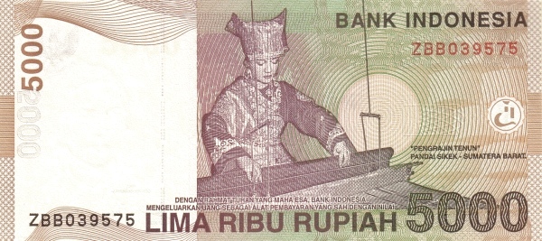 The reverse of the banknote highlights Indonesia’s rich cultural heritage, depicting a traditional textile weaver from West Sumatra at a loom. The scene captures the process of hand-weaving, with careful attention to the loom structure, posture of the figure, and surrounding motifs. Decorative wave patterns and circular security elements frame the central illustration, while the denomination “5000” is repeated clearly for easy identification. The reverse design balances cultural storytelling with functional clarity, making this issue particularly appealing from a museum and numismatic perspective.