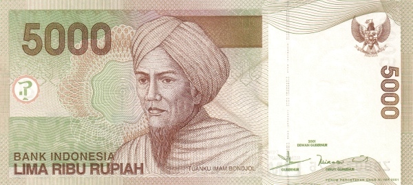 On the front of the note, the design is dominated by a finely engraved portrait of Tuanku Imam Bonjol, a key national hero and leader of the Padri War in West Sumatra. He is shown wearing a traditional turban and robe, rendered in detailed intaglio-style linework that gives depth and texture to the portrait. The denomination “5000” appears prominently in the upper left and lower right, integrated into flowing guilloché patterns. The words BANK INDONESIA and LIMA RIBU RUPIAH are clearly printed, accompanied by official signatures and the national Garuda emblem, reinforcing the note’s authority as legal tender. Subtle background patterns, microtext elements, and tonal shading contribute both to security and to the refined aesthetic typical of this series.