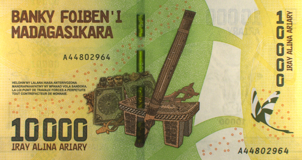 On the front of the banknote, the design focuses on traditional Malagasy craftsmanship and tools, symbolising labour, skills, and productivity. Prominently featured are carved wooden implements and artisanal objects, set against a layered background of warm yellow and green tones. Security elements such as a vertical holographic strip, micro-patterned dots, fine-line engraving, and bold denomination numerals are integrated into the design. The text “Banky Foiben’i Madagasikara” is clearly visible, along with the denomination “10,000 Ariary,” serial numbers, and subtle map references to Madagascar.