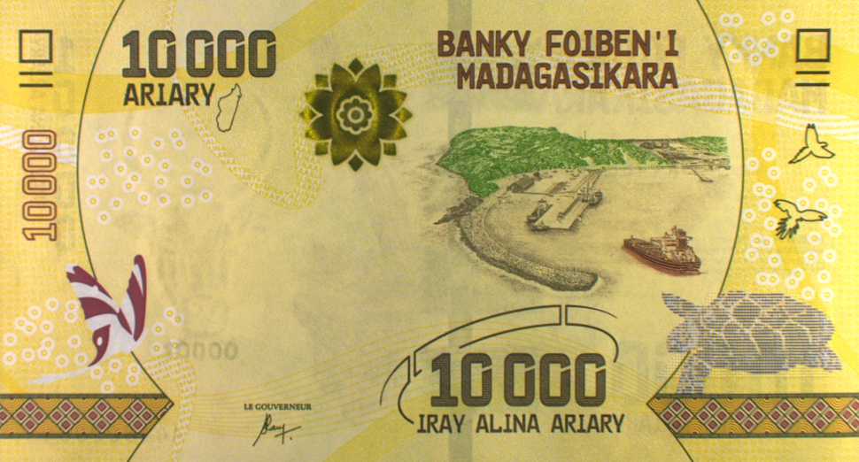 The reverse of the note showcases the Port of Ehoala (Port d’Ehoala) near Tolagnaro (Fort Dauphin), a major deep-water port that plays a crucial role in Madagascar’s international trade, particularly for mining exports and maritime logistics. The illustration depicts the harbour infrastructure, shoreline, and vessels, emphasising the country’s connection to global shipping routes. The scene is framed within a circular motif, complemented by botanical elements, birds, and geometric patterns that echo Madagascar’s biodiversity. The denomination is repeated in large numerals, reinforcing its status as a high-value note.