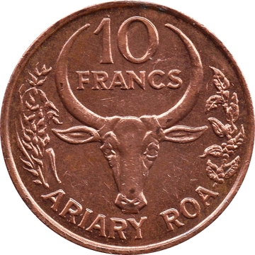 The reverse displays the denomination prominently, with “10 FRANCS” at the top and “ARIARY ROA” (2 Ariary) below. At the centre is a stylised zebu cattle head, an important cultural and economic symbol in Madagascar, flanked by decorative branches. The dual-denomination layout clearly reflects the coexistence of the Ariary and Franc systems at the time of issue.
