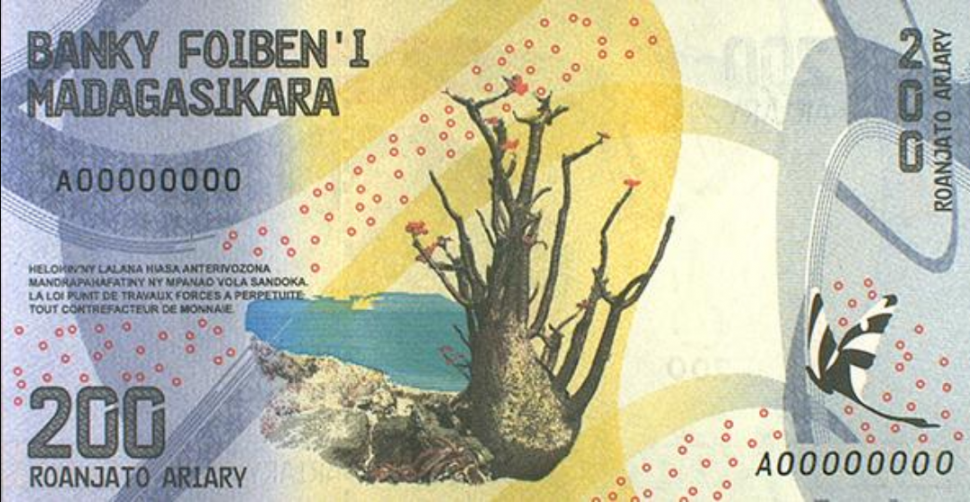 The front of the 200 Ariary banknote features a striking illustration inspired by Madagascar’s distinctive natural landscape. A stylised depiction of endemic flora is shown prominently, reflecting the island’s unique plant life found nowhere else in the world. The design uses layered colour gradients, fine dot patterns, and flowing lines to create depth and movement. The denomination “200 Ariary” is clearly displayed in Arabic numerals, alongside the name of the issuing authority, Banky Foiben’i Madagasikara. Modern security features, including microtext, latent images, and tactile elements, are integrated seamlessly into the artwork.