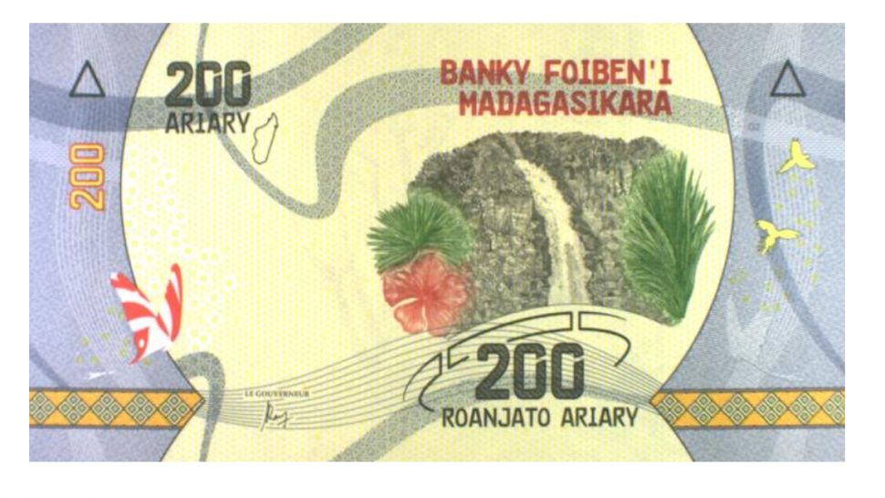 The reverse of the banknote showcases a scenic waterfall from the Amber Mountain region in northern Madagascar, an area known for its lush rainforests, waterfalls, and rich wildlife. The waterfall is framed by tropical vegetation, reinforcing the theme of natural heritage and environmental conservation. Additional design elements include stylised birds, geometric patterns, and security motifs that enhance both the visual appeal and counterfeit resistance of the note. The denomination is repeated, along with a small outline map of Madagascar, reinforcing the national identity of the currency.
