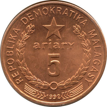 The obverse of the coin displays the national identity of Madagascar, with the inscription “Repoblika Demokratika Malagasy” around the edge. At the centre is a prominent five-pointed star above the denomination “ariary 5”, framed by a wreath motif. The date appears below, reinforcing the coin’s place within Madagascar’s post-currency-reform era. The copper-coloured finish and simple yet symbolic design are characteristic of early 2000s Malagasy coinage.
