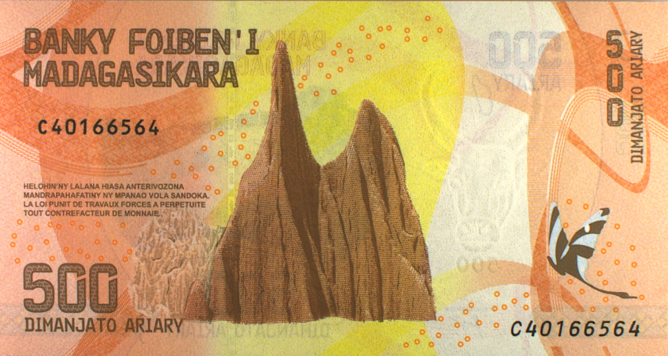 The front of the banknote features a striking illustration of dramatic rocky pinnacles rising from the landscape, rendered in warm orange and brown tones against layered abstract security patterns. The design reflects Madagascar’s unique geology and biodiversity, with modern graphic elements, micro-patterning, and colour gradients used to enhance both security and visual appeal. The denomination “500 Ariary” is clearly displayed, alongside serial numbers, tactile elements, and the issuing authority name Banky Foiben’i Madagasikara.