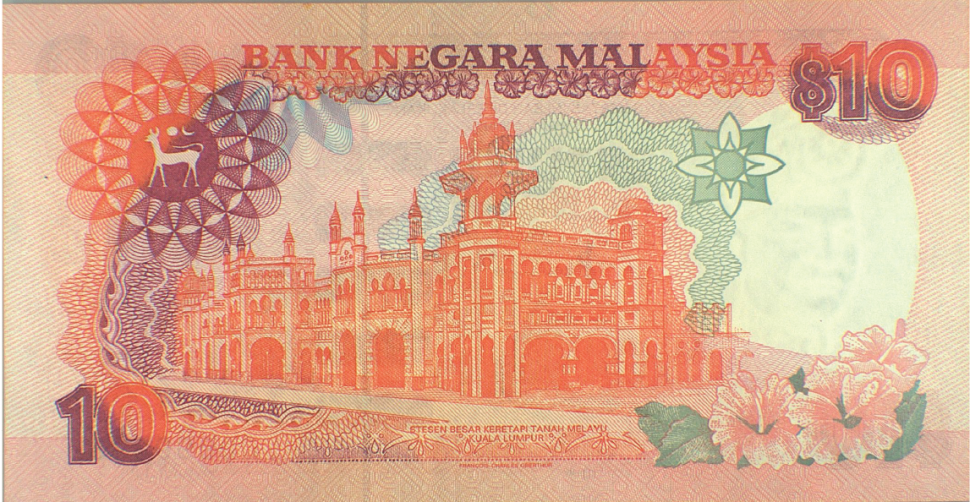 The reverse of the note features an architectural illustration of the Sultan Abdul Samad Building in Kuala Lumpur, a landmark closely associated with Malaysia’s administrative and colonial history. The building is rendered in detailed line engraving, showing its clock tower, domes, and arched façade, surrounded by decorative floral elements and geometric security patterns. The denomination “10” appears in multiple positions, integrated into the design alongside ornamental motifs and fine background textures. The reverse design balances national symbolism with technical engraving, making it one of the most recognisable designs of the 2nd series.