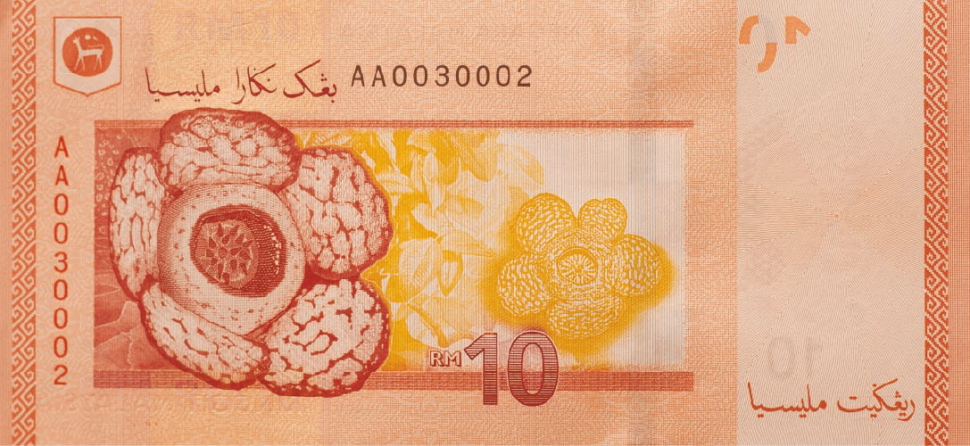 On the reverse, the design centres on Malaysia’s iconic Rafflesia bloom, shown large and prominent, with petal texture and dotted patterning clearly defined. The floral subject is framed by dense geometric background work and fine repeating line structures that create depth when viewed up close. The denomination “RM 10” appears again within the design, while polymer clear areas and security features remain visible at the edges, including translucent zones and embedded anti-copy detailing that helps distinguish genuine notes from reproductions.