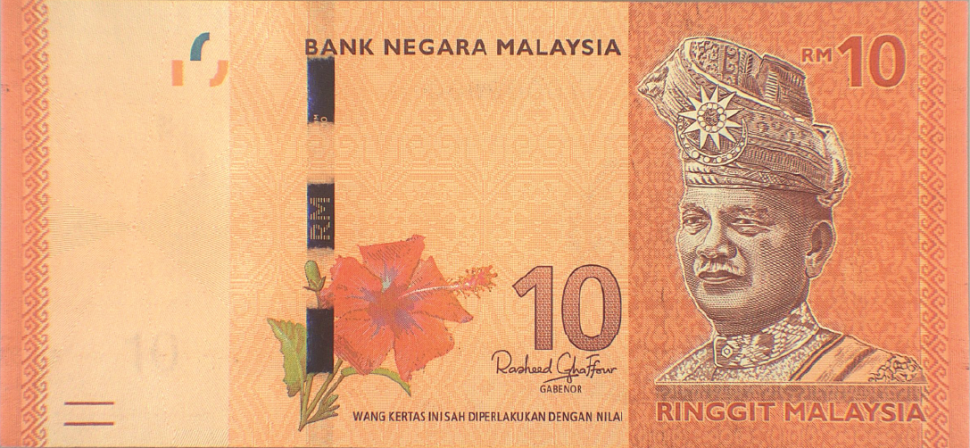 On the front, the note is dominated by a detailed engraved portrait of Tuanku Abdul Rahman (Malaysia’s first Yang di-Pertuan Agong) in ceremonial dress, positioned on the right within a rich orange field. Fine guilloché patterns and micro-line textures radiate across the background, with the denomination “10” repeated in multiple placements, including a bold central numeral. A hibiscus (Bunga Raya) motif sits toward the lower-left of the main design, rendered with soft colour gradation against the patterned base. The left side contains the polymer security window area, including clear/translucent sections and embedded elements typical of this series, plus small registration features and colour effects that shift subtly with viewing angle. “BANK NEGARA MALAYSIA” appears across the top margin, with the Governor’s signature placed below the central denomination.