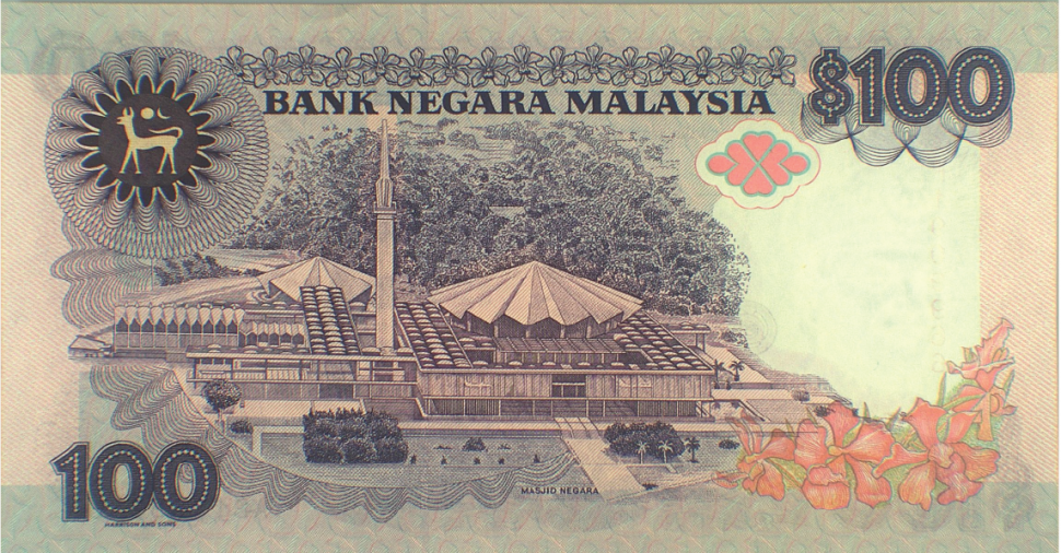 The reverse of the 100 Ringgit note features Masjid Negara (the National Mosque) in Kuala Lumpur, one of Malaysia’s most important modern landmarks. The mosque is depicted with architectural precision, highlighting its distinctive umbrella-style roof and minaret, set against landscaped surroundings. Decorative floral motifs, denomination numerals, and the Bank Negara Malaysia title frame the scene, with detailed background patterns and security designs filling the open fields of the note. The reverse design balances cultural heritage with modern national identity, a defining characteristic of the 2nd series.
