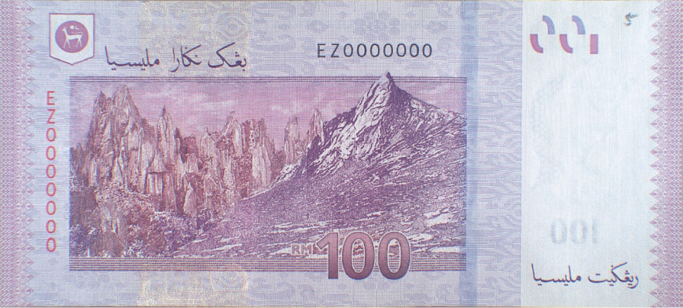 On the reverse of the note, the central image depicts a dramatic limestone mountain landscape, widely associated with Malaysia’s distinctive karst formations. The reminder of rugged peaks rising sharply from the terrain is rendered in fine linework, with subtle tonal gradients that give depth and texture to the scene. The denomination “RM 100” is clearly marked beneath the illustration, while patterned backgrounds and geometric motifs provide both visual balance and anti-counterfeiting protection. A transparent window and colour-shifting elements are integrated into the design, characteristic of the 4th series’ enhanced security standards.