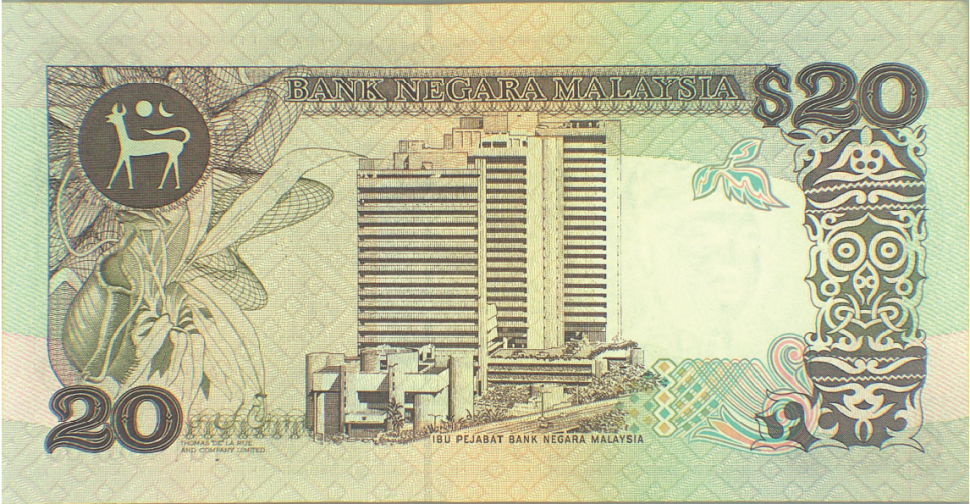 The reverse of the note depicts the headquarters of Bank Negara Malaysia in Kuala Lumpur, rendered in detailed architectural engraving. The building is shown from a frontal perspective, emphasising symmetry and institutional authority, with landscaped grounds and access roads carefully illustrated. Surrounding the central vignette are traditional Malaysian decorative elements, abstract security patterns, and denomination numerals placed in opposing corners. A circular emblem incorporating the Malayan deer symbol reinforces national identity, while the intricate background textures reflect the high production standards of the era.