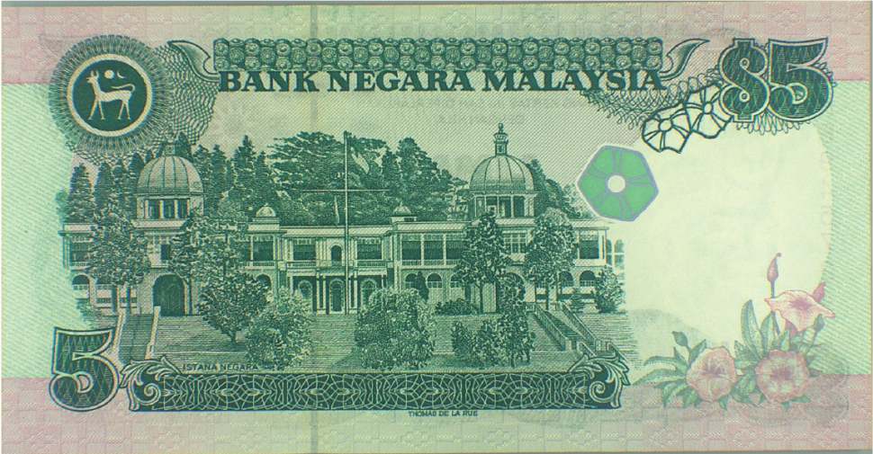 The reverse of the note depicts Istana Negara, the former National Palace of Malaysia, presented in a balanced architectural composition. The palace is shown with its domed roofs, symmetrical façade, and landscaped surroundings, engraved in fine detail that captures both structure and texture. Decorative elements frame the scene, including floral designs and repeating geometric borders, while the denomination “$5” appears in the corners. A stylised national emblem motif is incorporated into the design, reinforcing the note’s official status and cultural significance.
