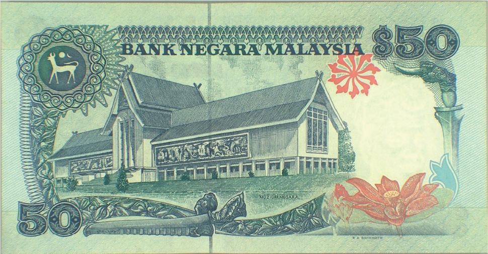 The reverse of the banknote depicts Istana Negara, the former National Palace of Malaysia, rendered in precise architectural detail. The palace is shown with its distinctive domes and symmetrical façade, surrounded by ornamental scrollwork and floral elements that balance the composition. The denomination “50” appears again in multiple positions, integrated into the surrounding decorative framework. Subtle colour blending, layered inks, and detailed line shading highlight the craftsmanship associated with Malaysia’s second series banknote production.
