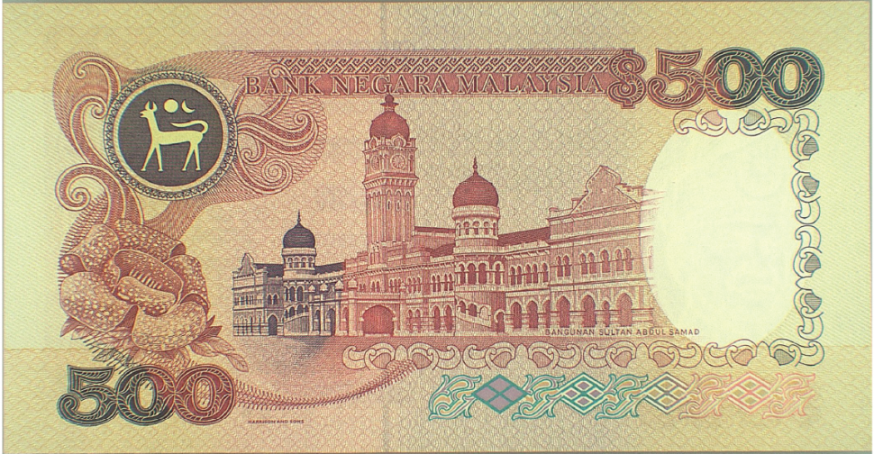The reverse of the note depicts the Sultan Abdul Samad Building in Kuala Lumpur, one of Malaysia’s most iconic historic landmarks. The building’s distinctive Moorish-inspired architecture, domes, and clock tower are rendered in detailed intaglio engraving, set against an ornate patterned background. Decorative floral elements and repeating security designs surround the central vignette, while the denomination “500” is clearly shown in multiple positions to ensure instant recognition.