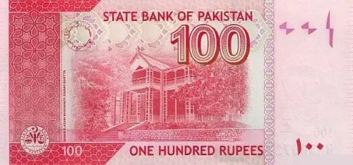 The one hundred Pakistani Rupee banknote is predominantly red in colour. On the obverse side is a portrait of Muhammad Ali Jinnah, founder of Pakistan. On the reverse side is an image of the Quaid-e-Azam Residency in Ziarat.