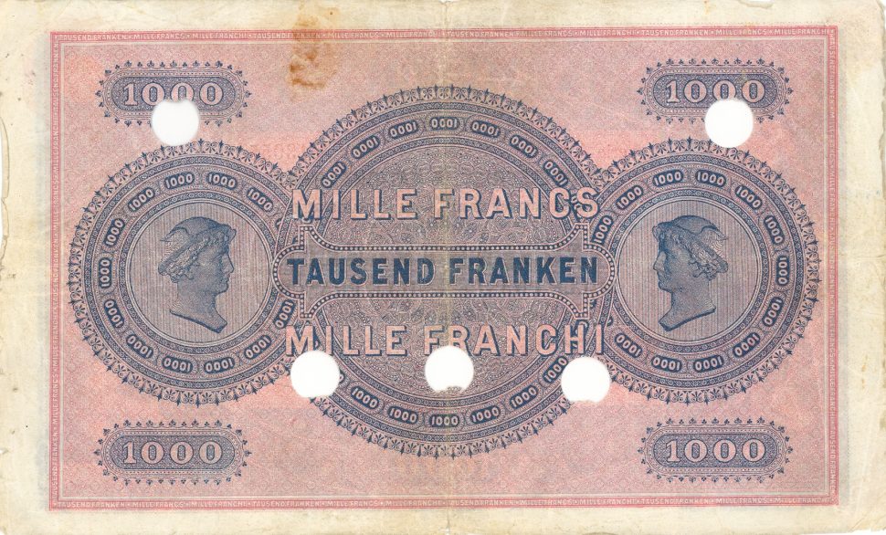 Swiss franc banknotes were issued in different denominations by the Swiss National Bank including this 1000 Swiss franc banknote (1st Series). This 1000 CHF banknote forms part of the withdrawn series of Swiss franc banknotes. This 1000 CHF banknote was issued in 1907 and was later withdrawn from circulation in Switzerland.