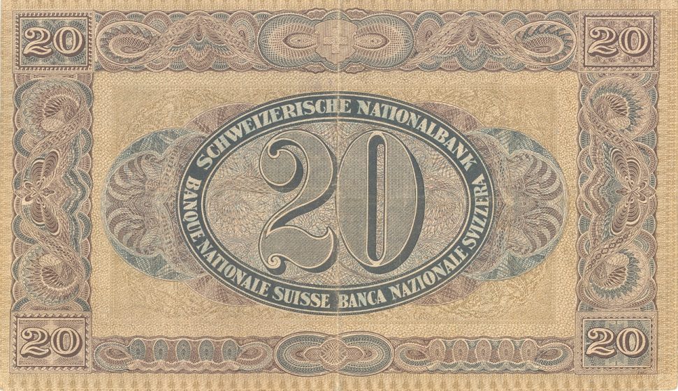 This 20 CHF paper banknote is predominantly blue and grey in colour. On the obverse side is a classical allegorical female figure representing Helvetia, symbolising Switzerland and national identity. The design features finely detailed engraving, decorative borders and ornamental patterns typical of early twentieth-century Swiss banknote design. On the reverse of the note are intricate geometric motifs and formal inscription panels, reflecting the traditional and secure printing style of the period. Wording on the banknote is SCHWEIZERISCHE NATIONALBANK.