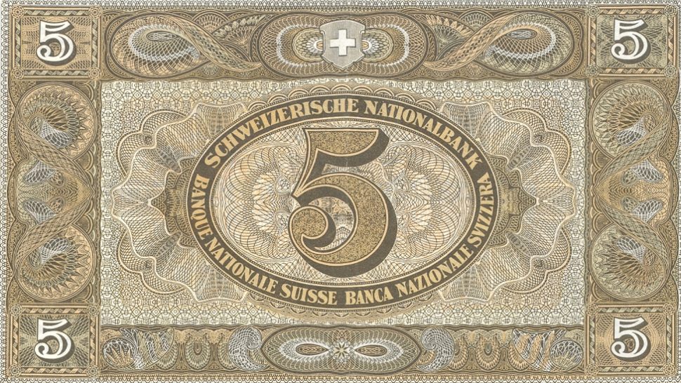 This 5 CHF paper banknote is predominantly brown and beige in colour. On the obverse side is a classical allegorical female figure symbolising Helvetia, representing Switzerland and national unity. The design features ornate decorative patterns and detailed engraving typical of early twentieth-century banknote printing. On the reverse of the note are intricate geometric motifs and formal text panels, reflecting the traditional style of Swiss banknote design. Wording on the banknote is SCHWEIZERISCHE NATIONALBANK.