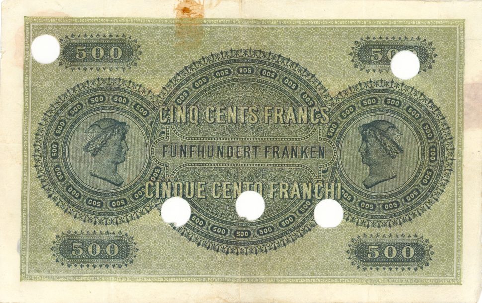 Swiss franc banknotes were issued in different denominations by the Swiss National Bank including this 500 Swiss franc banknote (1st Series). This 500 CHF banknote forms part of the withdrawn series of Swiss franc banknotes. This 500 CHF banknote was issued in 1907 and was later withdrawn from circulation in Switzerland.
