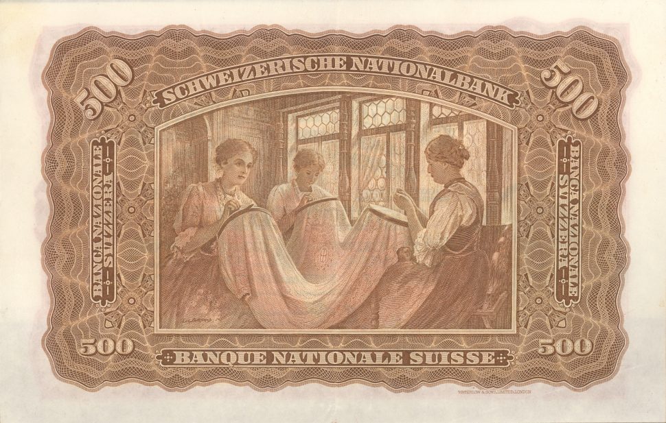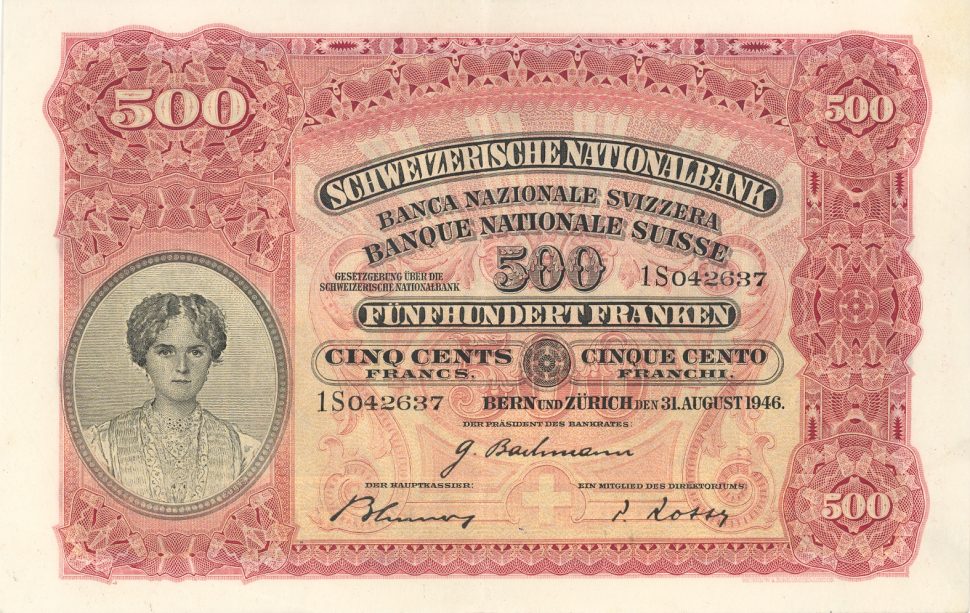 This 500 CHF paper banknote is predominantly brown and violet in colour. On the obverse side is a finely engraved male head shown within a decorative medallion, reflecting the classical portrait style used on early twentieth-century Swiss banknotes. The surrounding design features ornate borders, floral patterns and detailed line engraving typical of historic Swiss currency printing. On the reverse of the note is an allegorical scene representing industry and commerce, symbolising Switzerland’s economic development and craftsmanship during the period. Wording on the banknote is SCHWEIZERISCHE NATIONALBANK.